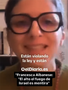 Tal como explica día a día, Francesca Albanese, i ho publica fa uns dies  al diario.es,  “El pla de pau es una mentida, una farsa. Desde que es va firmar ja han mort mes de 250 persones, han detingut a  molta gent , i l’exercit i esls colons seguiexen atacan diversos de Cisjordania” ( Podeu consultar el video a Instagram  ) Paraules semblats, ha sigut les de  Irene Zugasti a la Base TV, després de la imposició de Pla de Pau, de Trump, que només ha sevit per a legalitzar la partició continua molt actiu, d’una manera o altra, el genocidi del poble palestí: “Hay que entender el efecto Palestina’ (decía Francesca Albanese hace unos días) Palestina ha sido un despertar. Como la pastilla roja en Matrix. Nos ha mostrado el mundo en el que vivimos” , explica Zuga
